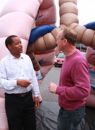 Hyson Green Market place was the venue for a slightly unusual Health check on Bank Holiday Sunday, August 25th 2013. The unusual feature were the inflatable lungs taking pride of place at the front of the display area. Participants realised all those meetings had all been worth it as 75 local residents had their blood pressure, body mass index and blood sugar analysed. |